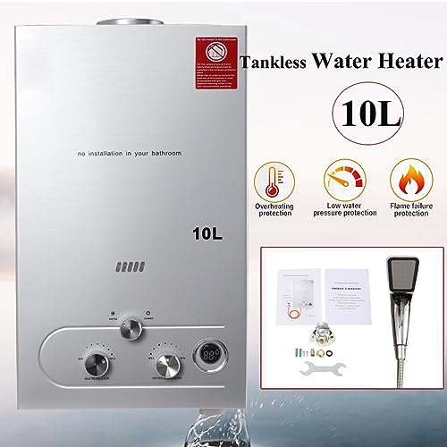 ECUTEE 10L 20KW Scaldabagno a gas di petrolio liquefatto Scaldabagno a gas propano/GPL, Scaldabagno istantaneo senza serbatoio con kit doccia, Per docce da esterno, argento