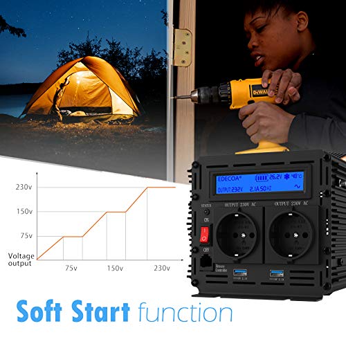 ALTA TECNOLOGIA: Transformatore 24v 220v ha il sistema SPWM che riduce le interruzioni dell'inverter, il sistema SOFT START, AUTO START, riducendo e ottimizzando i tempi di recupero. L'inverter 1500w ha anche un sistema di isolamento galvanico. Con ventilatori silenziosi e intelligenti che si attivano solo quando Le convertitore di potenza raggiunge i 45° C, i suoi materiali in alluminio che rendono il trasformatore leggero e aiutano a resistere al calore e alle condizioni ambientali