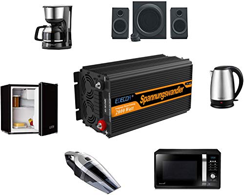 Collegato ovunque: è leggero, pesa 3,1 kg e misura 28,5 * 15 * 12,5 cm che ti consente di collegarlo alla tua auto, roulotte, casa di campagna, installazione di pannelli solari. È ideale per collegare dispositivi con meno di 2000w come piccoli frigoriferi, computer, altoparlanti, luci, TV. Non funziona con le macchine da caffè a capsule tipo Nespresso, per queste macchine da caffè è necessaria un'onda pura. Include certificato CE, EMC, LVD per le omologazioni