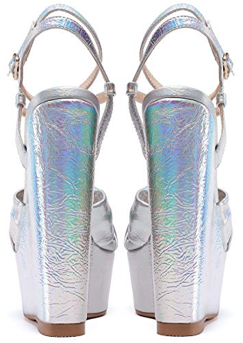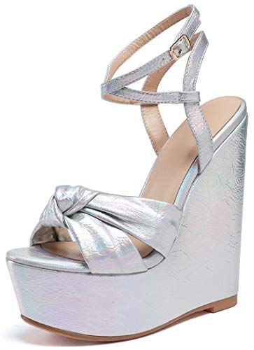 EDEFS Sandali Donna Zeppa Punta Aperta Plateau Sandalo Cinturino Alla Caviglia con Nodi Scarpe Metallico Argento EU37