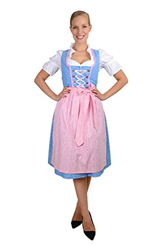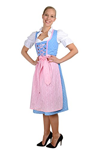 Edelnice, 3 pezzi, costume tradizionale Dirndl azzurro rosa con graziosi fiori bianchi, con grembiule e camicetta per Dirndl, taglia 32-58