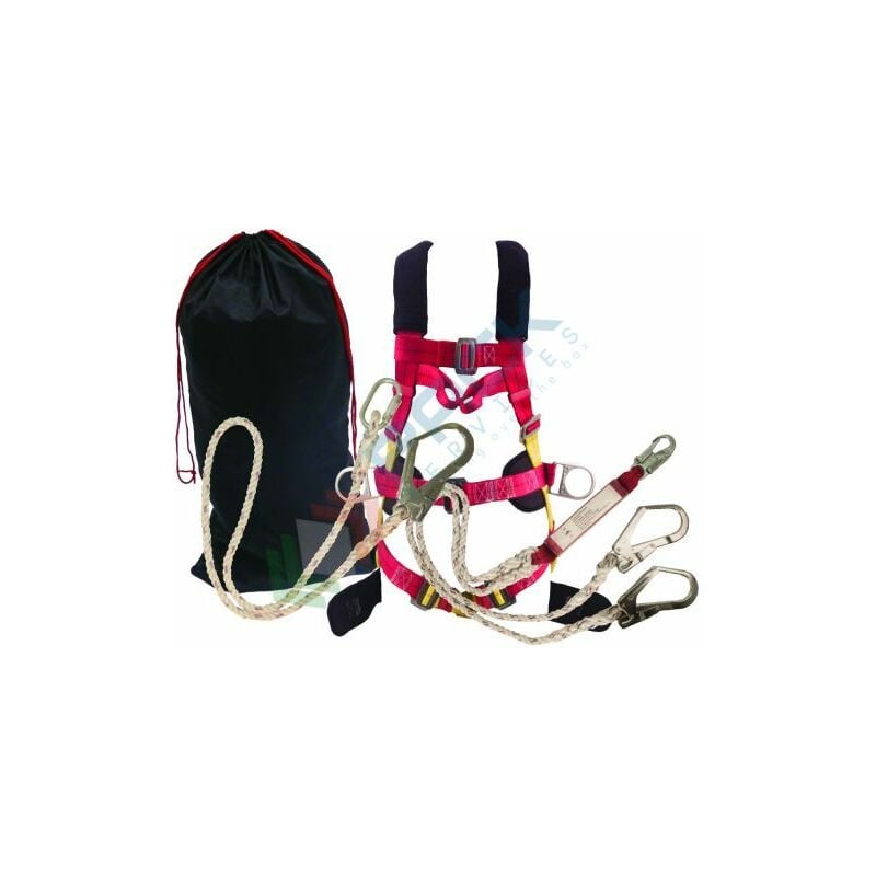 Imbracatura Comfort Plus a due punti di ancoraggio,-Cordino singolo con moschettone e gancio da ponteggio,-Cordino doppio con assorbitore di energia, gancio a scatto e due ganci da ponteggio,-Borsa a tracolla in Nylon Certificato CE