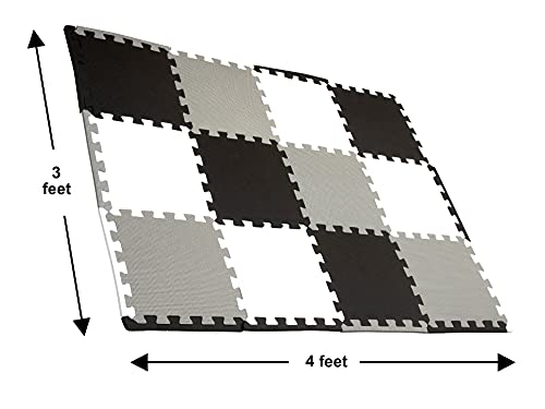 SUPERFICIE FLESSIBILE: ogni piastrella del set tappetino in gommapiuma misura 30,5 cm. (1 piede) x 30,5 cm. (1 piede) x 1 cm. (0,39 pollici) di spessore il che darà una superficie completa di 1,24 m (4,07 piedi) x 0,94 m. (3,06 piedi) - 1,16 metri quadrati (12 piedi quadrati). I bordi aggiunti combaceranno alla perfezione con gli angoli e con le pareti.