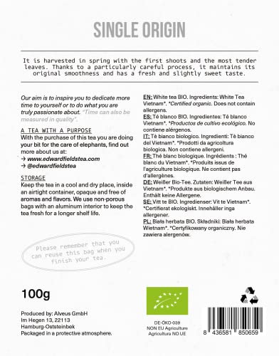 Edward Fields Tea ® - Tè bianco Vietnam sfuso biologico monorigine. Tè bio raccolto a mano con ingredienti naturali ed ecologici, 100 grammi.