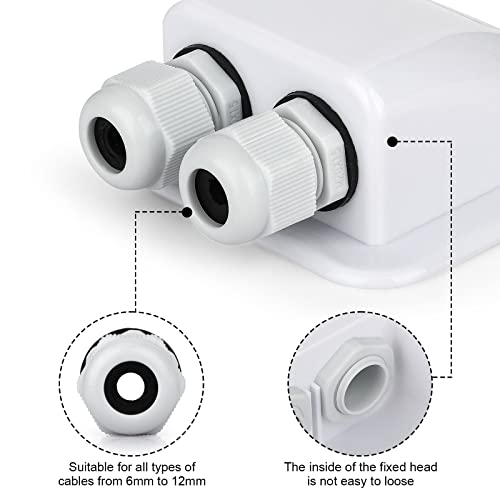 SPECIFICHE: 4,5" L x 3,7" W x 1,6" H, intervallo di diametro del pressacavo da 6 mm a 12 mm, impermeabile IP68.