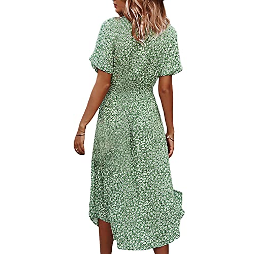 Eghunooye Abito estivo da donna, a maniche corte, scollo a V, con bottoni, a pois, per il tempo libero, con cintura verde L