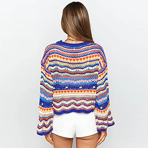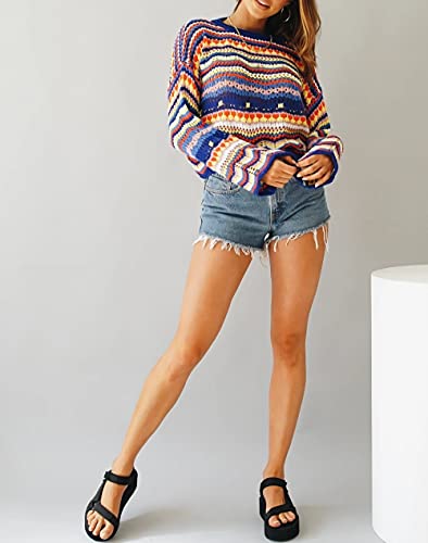 Eghunooze - Maglione da donna allentato a maniche lunghe, motivo arcobaleno, motivo floreale, girocollo, per l'autunno e l'inverno, Blu reale, S