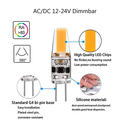 EIMOPE Lampadine G4 LED dimmerabili, 3 W LED equivalenti a 30 W, lampadina alogena, bianco caldo 2700 K, AC/DC 12-24 V, senza sfarfallio, angolo di fascio 360 °, confezione da 5