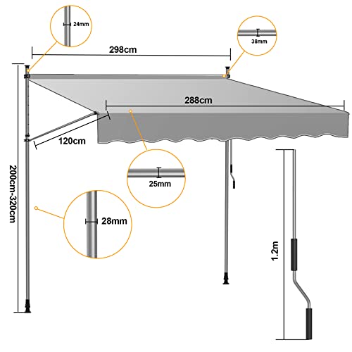 Facile regolazione dell'altezza: con l'aiuto della manovella manuale, è possibile regolare l'angolo della tenda da sole a morsetto in qualsiasi momento, non importa dove si trovi il sole. È possibile allineare al meglio la tenda e proteggerla dal sole. Il supporto ha 10 fori e piedini regolabili e l'altezza della tenda da balcone può essere regolata tra 2 e 3 m.