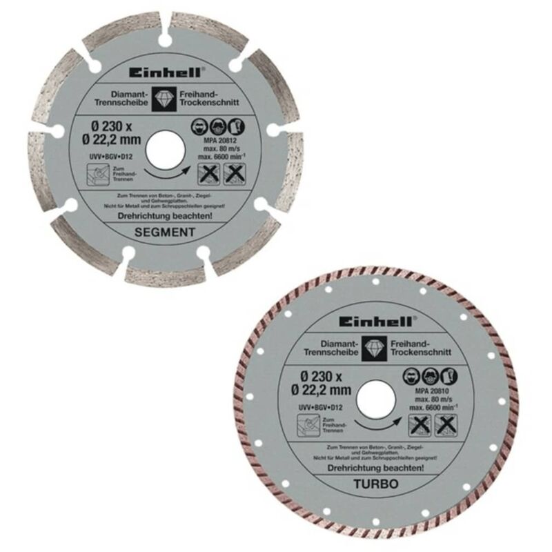 Set 2 dischi diamantati dm mm 230 disco diamantato lama Set 2 dischi diamantati 1 disco diamantato 230 mm turbo -per pietra, cemento, materiali edili. Disco diamantato turbo a corona continua. Adatto per cemento, granito, marmo, klinker ed ogni tipo di materiale da costruzione. Con alta concentrazione di materiale da taglio di diamante per tagli precisi. 1 disco diamantato 230 mm a corona segmentata - per materiali edili e mattoni. Disco diamantato troncatore con corona segmentata, rivestimento di 7 mm sinterizzato direttamente. Adatto per tutti i tipi di materiali da costruzione come klinker, mattoni, cemento, ecc. Dati imballo codice articolo 44.403.33 Quantità 1 Larghezza 380 mm Altezza 6 mm Profondità 280 mm Peso 1,22 kg