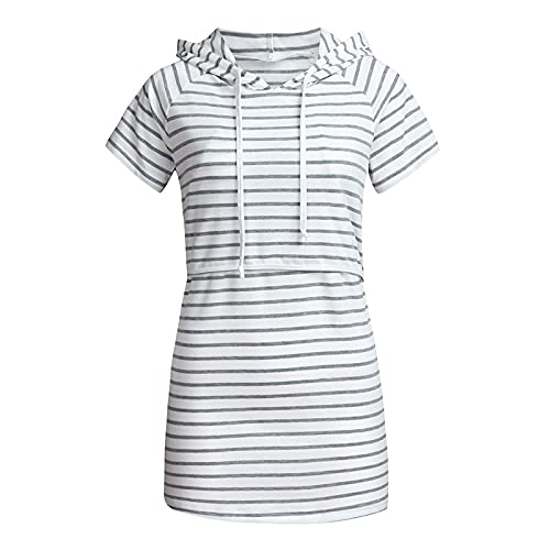 EiuEQIU Maglia da donna a maniche corte per allattamento, con cappuccio, a righe, girocollo, per gravidanza, a maniche corte, grigio., M