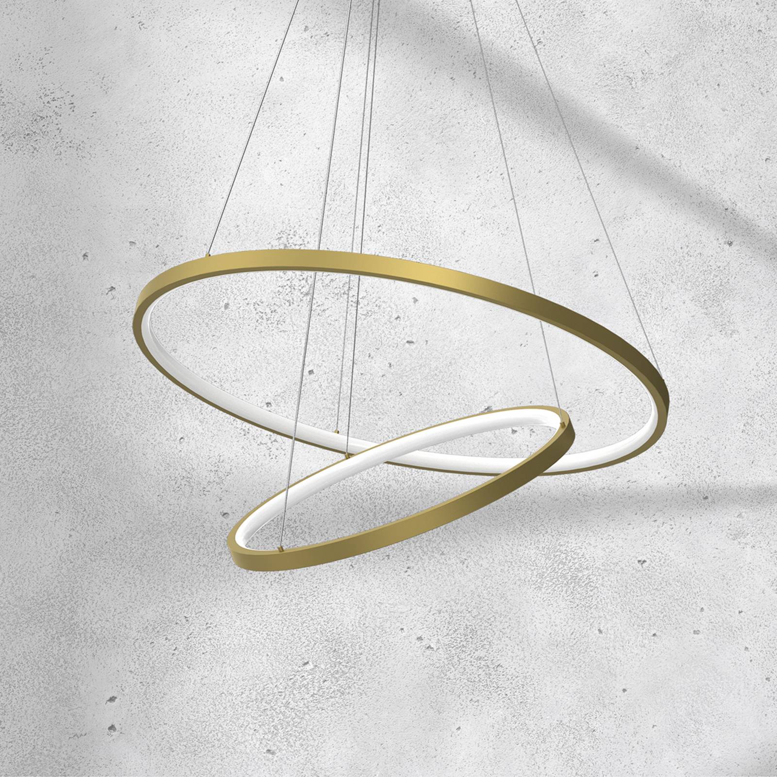 Elegante lampada a sospensione Rotonda LED con due anelli dorati La lampada a sospensione Rotonda LED è dotata di due anelli di dimensioni diverse, al cui interno sono installati LED bianchi neutri dietro diffusori satinati. L'altezza di sospensione e l'inclinazione degli anelli possono essere determinate in fase di installazione accorciando i fili di sospensione. Ideale per ambienti prestigiosi in aree pubbliche/commerciali.