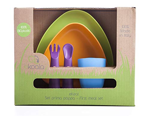 EKoala - eKeat, Set Prima Pappa per Bambini, Composto da Piatto Piano, Piatto Fondo, Bicchiere, Forchetta e Cucchiaio, 100% Bioplastica Biodegradabile (Multicolore 1)