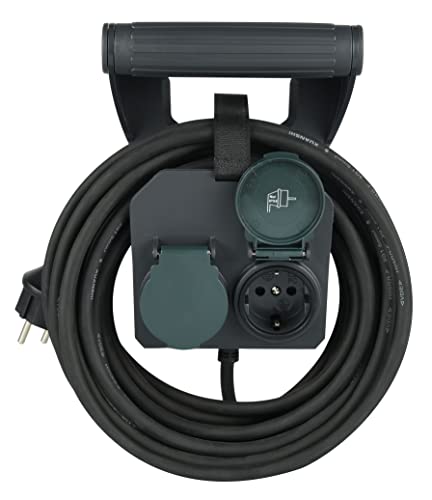 Electraline 01676 Prolunga elttrica Professionale 10M, IP44, 2 prese Schuko con tappi a chiusura automatica, Maniglia ergonomica con Avvolgi Prolunga, Avvolgicavo, Cavo H05RR-F 3G1.5 IP44, Nero