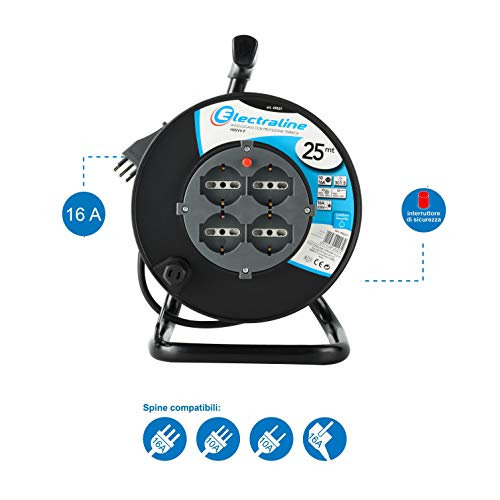 Electraline 49027 prolunga elettrica con avvolgicavo 25 mt 4 prese polivalenti (schuko + 10/16A) spina grande 16A, con protezione, nero - sezione cavo 3G1,5 mm²