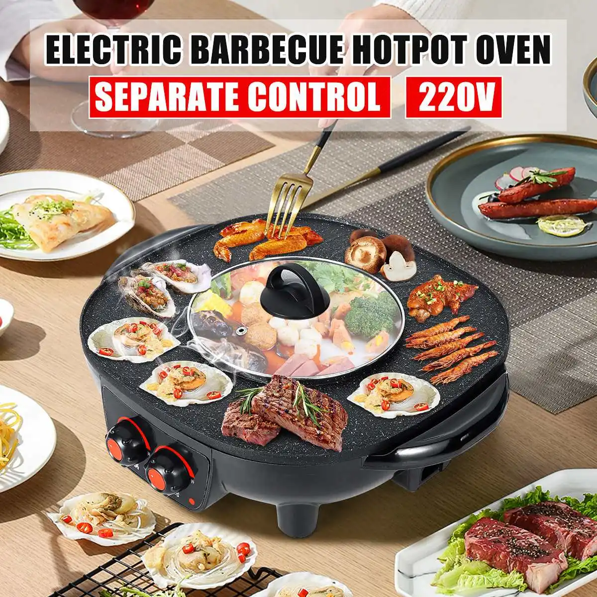2in1 Electric Grill Pan Hotpot Oil Pan Heater Table Top Grill Griddle Barbecue Plate Nonstick Bbq Barbecue Baking Flat Pan Pot
