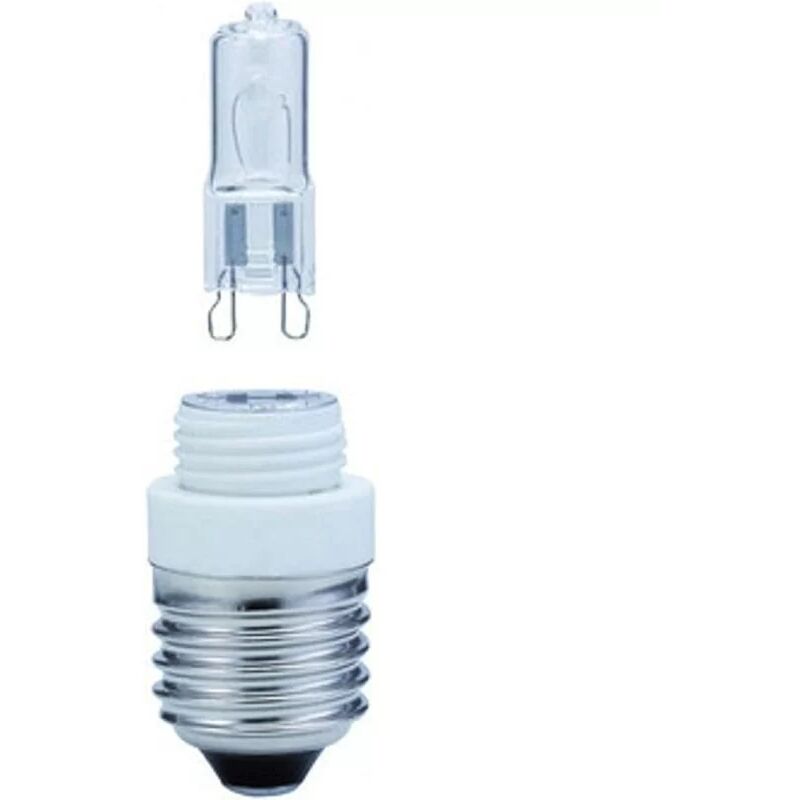 Base della lampadina. Voltaggio: 230 V. Potenza: 33 W. Dimensioni: 28x51mm Durata: 2000 H. Base: E27. Colore chiaro. Temperatura colore: 2800K. 33 kWh/1000 ore. Con minialogena venduta.