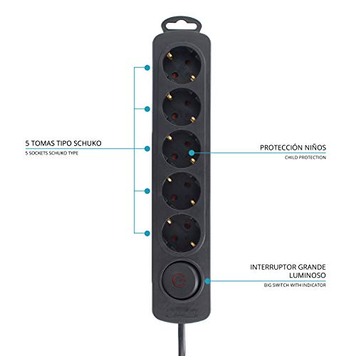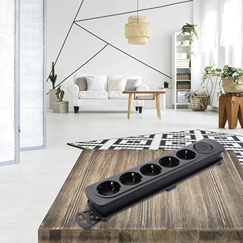 Multiple base in colore nero con motivo di prolunga di 5 prese, Tipo schucko, e ampio con un cavo da 1,4 metri di lunghezza e 3 fili di 1,5 mmq di sezione ogni uno di classe h05 W-3g.