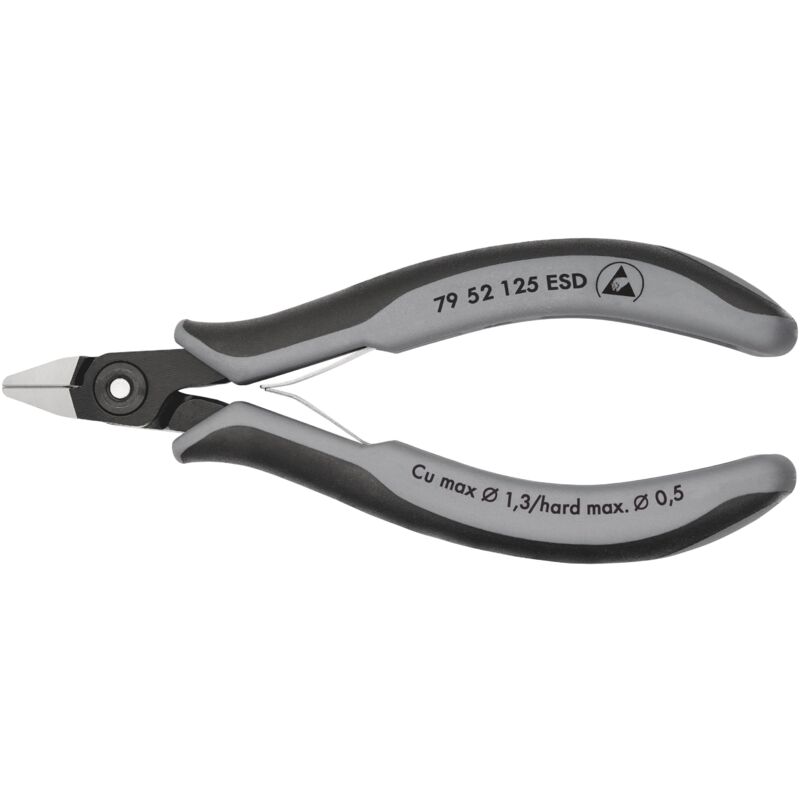 79 52 125 ESD Tronchese laterale di precisione per elettronica ESD esecuzione a dispersione elettrica - dissipativa. Pinze particolarmente adatte per il taglio di alta precisone nell'elettronica e nella meccanica fine. Taglienti affilati, rettificati ad alta precisione con sfaccettatura ultrapiccola per tagli precisi su componenti elettronici delicati;