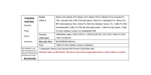 Compatibile con unità radio: Becker 2234/35/37, CDR 22, CR 22, Mexico PRO MP3/7942, Monza, Traffic Pro 7949 con sistema dialogo/Talk High Speed ecc.