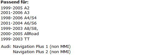 Questo adattatore è compatibile con Audi 1999-2005 A2, 2001-2006 A3,1998-2006 A4/S4, 2001-2004 A6/S6, 1999-2003 A8/S8, 2000-2005 AllRoad, 1999-2003 TT, Radio's Chorus 1, Chorus 2, Concert 1, Concert 2