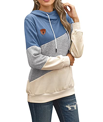Eledobby Donna Patchwork Felpe con Collo Alto Pullover con Coulisse Felpa a Maniche Lunghe Moda Donna Pullover con Cappuccio Elegante Casual Top Primavera Autunno Abbigliamento Blu M