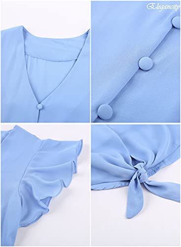 Elegancity Donna Camicia Blu Chiffon Camicetta Donna Elegante Scollo a V Manica Corta Manica Lanterna Camicia Allentata Monocromo M