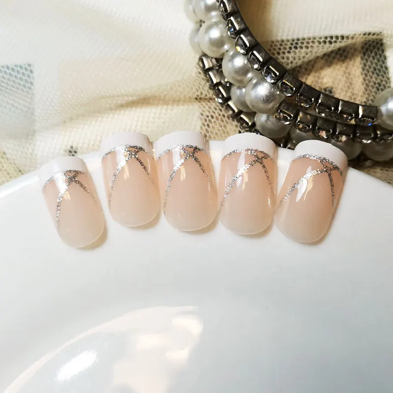 Elegant White French Wear Manicure Nail Tips Simple Silver Line Fake Nails Q0020