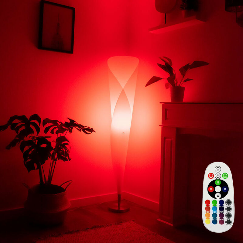 Descrizione Elegante lampada da terra con un elegante paralume in plastica. Questa innovativa lampada da terra si mostra in un design straordinario per uno stile d'arredo futuristico. Il paralume in plastica, che si assottiglia verso il basso, contiene una presa E27 per ospitare sorgenti luminose fino a 60 watt. La base di facile appoggio in il nichel fornisce la necessaria stabilità. Grazie a diversi colori, puoi decidere se vuoi aumentare l'atmosfera nel tuo soggiorno, rendere più piccante la tua cucina o dai una dose extra di stile alla tua camera da letto. Con il telecomando incluso puoi comodamente accendere e spegnere le tue luci di design e regolarle dalla divano . Consumi rispetto alle luci normali I faretti a LED consumano solo una quantità minima di elettricità e hanno un consumo persino inferiore rispetto alle lampade a risparmio energetico. Questo protegge l'ambiente e il tuo portafoglio. Una lampada LED RGB di alta qualità da 9 watt a risparmio energetico con telecomando