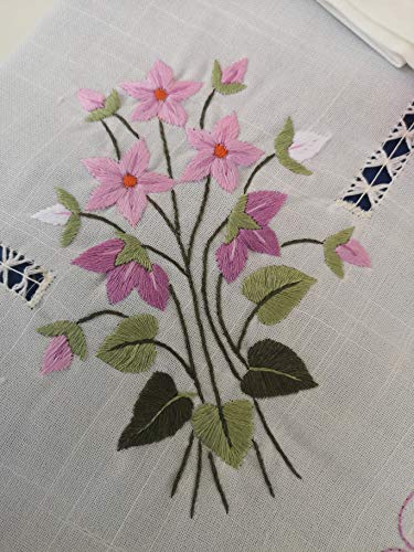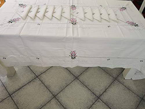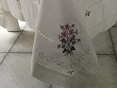 Elegante tovaglia x 12 in Misto Lino (40% Lino 60% Cotone) con Ricamo Fiori a Mano in Punto Pieno