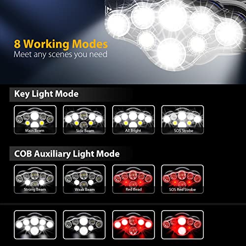 Lampada Frontale LED Ricaricabile:La lampada frontale è composta da 8 lampade a LED e 2 retroilluminazione rossa. Il faro è dotato di due batterie ricaricabili da 3.7 V 1200mAh 18650,che consente di vedere chiaramente tutti i dintorni. Il lampada frontale può essere utilizzato per una varietà di attività notturne come campeggio, caccia, pesca, ciclismo, corsa, escursionismo.che può darti l'illuminazione più brillante. Nota: quando si utilizza la batteria, rimuovere la plastica protettiva