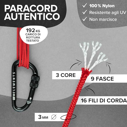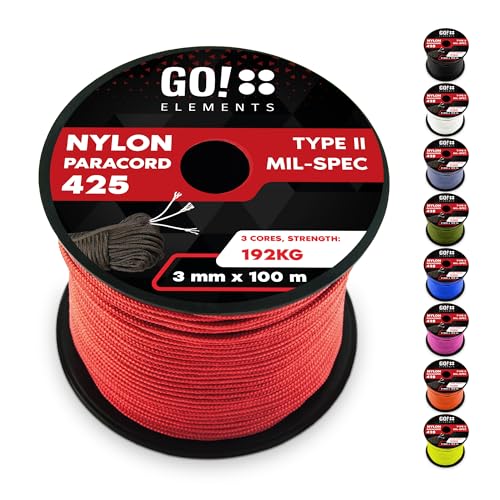 GO!elements 100m Paracord Corda in Nylon antistrappo - 3mm Paracord 425 Tipo II Linee Come Corda da Esterno, Corda Multiuso, Corda di Sopravvivenza - Linea in Nylon Max. 192kg, Colore: Rosso