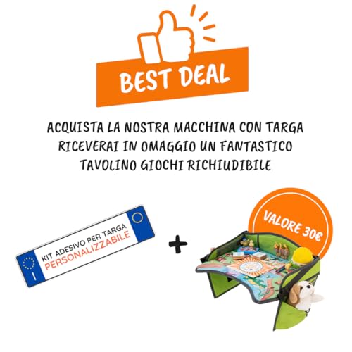 2 ACCESSORI ESCLUSIVI - con la tua auto elettrica BabyCar avrai uno splendido kit con 2 TARGHE ADESIVE PERSONALIZZABILI e in OMAGGIO un TAVOLINO per bambini multiuso portatile