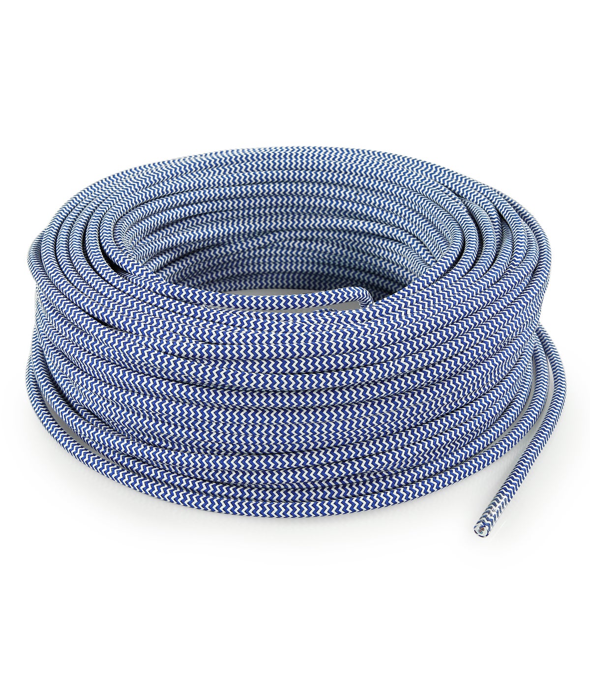 Cavo tessile tondo 2x0,75 50mt bianco/blu. Ideale per rinnovare i cavi di abat jour,lampadari e creare nuove sospensioni