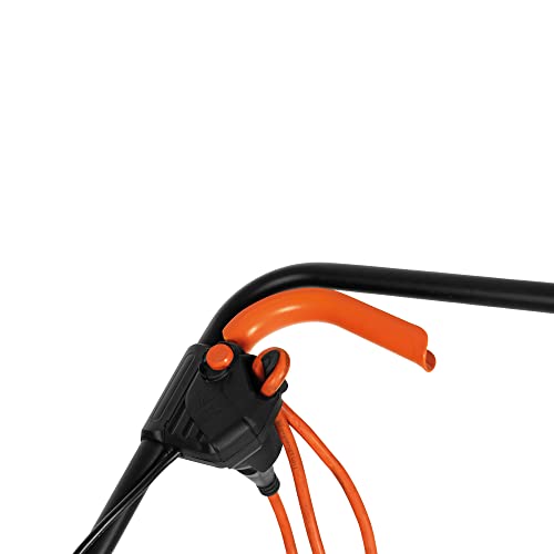 SENZA INGOMBRO E SICURO: L'impugnatura a sbarra si richiude per essere riposto salvaspazio. Lo scarificatore è dotato di un interruttore di sicurezza e di uno scarico trazione cavo.
