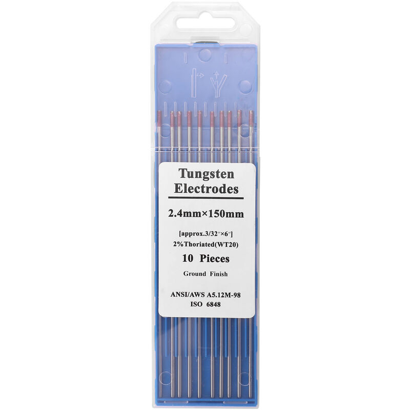 Questo materiale e un popolare elettrodo per uso generale grazie al perfetto comportamento dell'arco e alla durata delle punte fini. Caratteristiche: Elettrodi di tungsteno puro: il tungsteno puro ha un'elevata funzione di lavoro che rende difficile l'avvio e il mantenimento di un arco stabile. L'elevata velocita di combustione si traduce in una breve durata. Elettrodi di tungsteno lantanati: questo materiale e un ottimo sostituto non radioattivo per uso generale per il toriato. Ha prestazioni di accensione perfette, velocita di combustione ridotta, riaccensione perfetta e durata utile. Elettrodi di tungsteno toriati: questo materiale e un elettrodo popolare per uso generale grazie al perfetto comportamento dell'arco e alla durata delle punte fini. Puoi scegliere diversi colori in base alle diverse esigenze. Specifiche: Colore: rosso, oro, blu, verde (opzionale) Tipo: 1.6*150/2.4*150 (opzionale) Rosso: elettrodo di tungsteno toriato Saldatura di acciaio al carbonio, acciaio