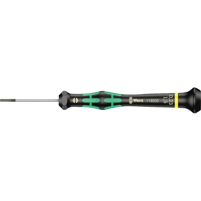 Dettagli tecnici Ambito di applicazione (cacciavite) Elettronica e meccanica di precisione Cacciaviti caratteristiche Impugnatura multicomponente Dimensione del prodotto, lunghezza 137 mm Dimensioni (Ø x L) 13 mm x 137 mm Forza Taglio Larghezza della lama 1.5 mm Lunghezza della lama 40 mm Materiale Acciaio per utensili Proprietà del materiale legato Tipo prodotto Cacciavite a taglio Cacciavite a taglio per elettronica, 0.23 x 1,5 x 40 mm Micro cacciavite Wera di alta qualità per avvitamenti meccanici di precisione. Sostenendo la mano sul cappuccio rotante e la zona di rotazione rapida sotto il cappuccio rotante è possibile eseguire un avvitamento veloce e fulmineo. Non è più necessario tanto tempo. Zone di presa con inserti morbidi integrati per trasmettere forze di avvitamento e svitamento più elevate. Zona di precisione per l'angolo di rotazione corretto durante i lavori di regolazione. La punta Wera Black Point offre una precisione perfetta e una protezione anticorrosione
