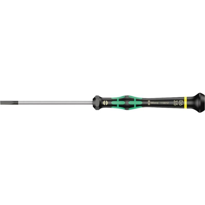 Dettagli tecnici Ambito di applicazione (cacciavite) Elettronica e meccanica di precisione Cacciaviti caratteristiche Impugnatura multicomponente Dimensione del prodotto, lunghezza 177 mm Dimensioni (Ø x L) 13 mm x 177 mm Forza Taglio Larghezza della lama 3.5 mm Lunghezza della lama 80 mm Materiale Acciaio per utensili Proprietà del materiale legato Tipo prodotto Cacciavite a taglio Cacciavite a taglio per elettronica, 0,60 x 3,5 x 80 mm Micro cacciavite Wera di alta qualità per avvitamenti meccanici di precisione. Sostenendo la mano sul cappuccio rotante e la zona di rotazione rapida sotto il cappuccio rotante è possibile eseguire un avvitamento veloce e fulmineo. Non è più necessario tanto tempo. Zone di presa dura per un'elevata velocità di lavoro, mentre le zone con impugnatura morbida garantiscono un'elevata trasmissione della coppia. Zona di precisione per l'angolo di rotazione corretto durante i lavori di regolazione. La punta Wera Black Point offre una precisione perfetta e