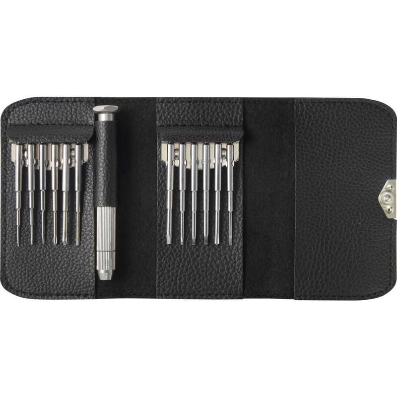 Dettagli tecnici Ambito di applicazione (cacciavite) Elettronica e meccanica di precisione Dimensione del prodotto, larghezza 60 mm Dimensione del prodotto, lunghezza 97 mm Dimensioni (L x L x A) 97 x 60 x 20 mm Dimensioni prodotto Altezza 20 mm Materiale Acciaio al cromo vanadio, Alluminio, PVC Peso 125 g Tipo prodotto Cacciavite per montaggio Set di cacciaviti di precisione da 13 pezzi Kit di cacciaviti con tutte le dimensioni principali per tutti i modelli Apple iPhone. Testo tradotto automaticamente Punti di forza e dettagli Ideal per lavori meccanici di precisioneElegante custodia in dotazioneSi adatta bene alla tasca dei pantaloni o in un sacchetto per quando si è in viaggioCon impugnatura completamente in metallo e superficie del profilo ondulato antiscivolo Caratteristiche Custodia compatta (95 x 60 x 22 mm)Design in formato tascabileMateriale della punta: CR-V.Materiale della custodia: PVCColori del prodotto:Custodia: NeraImpugnatura: ArgentoPunta per utensili: Argento