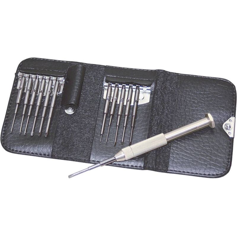 Dettagli tecnici Ambito di applicazione (cacciavite) Elettronica e meccanica di precisione Forza Taglio, Croce Phillips Indicazione di quantità (solo per elementi - LOV) 13 parti Lunghezza della lama 55 mm Materiale Acciaio al cromo vanadio Proprietà del materiale temperato Ulteriori dati tecnici Custodia ripiegata 95 x 60 x 20 mm Custodia ripiegata 95 x 60 x 20 mm Serie di cacciaviti di precisione a taglio/ a croce PH 13 pezzi. Ideale per tutti i professionisti nei campi di meccanica fine, elettronica, creazione gioielli, ottica. Consente di lavorare con precisione e a lungo anche in punti di difficile accesso. Punti di forza e dettagli A taglio 0,8 - 2,5 mm. A croce PH 1,2 e PH 3 Caratteristiche Fissaggio delle lame nell'astuccio in modo che non vadano perse Identificazione delle dimensioni delle lame sull'impugnatura. Incluso nella consegna Lame PH 1,2/PH 1,5/PH 1,7/PH 2,0/PH 2,5/PH 3 Lame a taglio 0,8/1,0/1,2/1,5/2,0/2,5 mm Impugnatura in ottone regolabile Custodia in ecopelle.