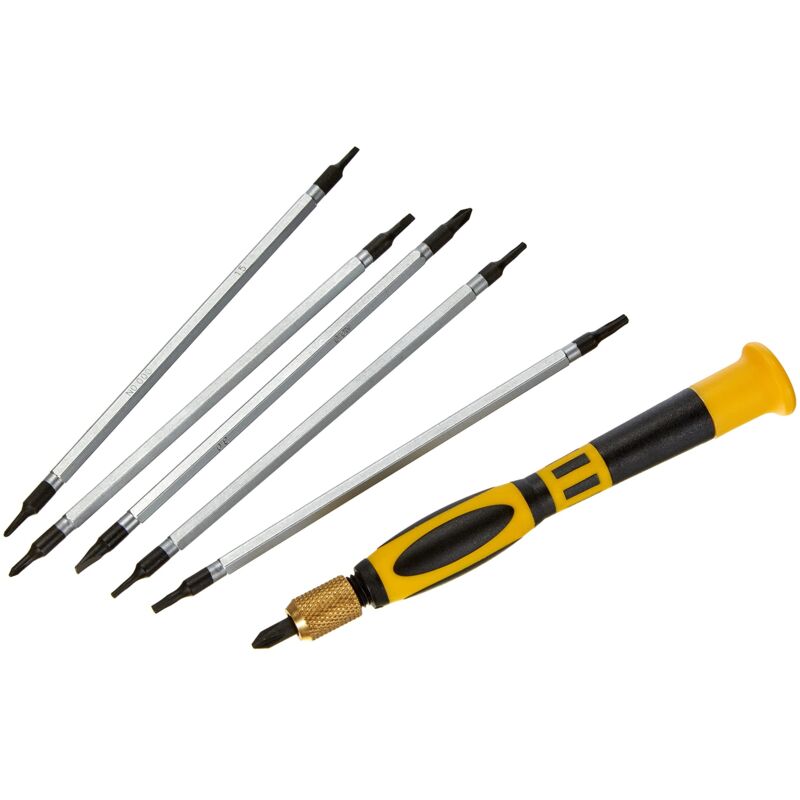Dettagli tecnici Ambito di applicazione (cacciavite) Elettronica e meccanica di precisione Contenuto 1 pz. Forza Taglio, Croce Phillips, Esalobo Interno (TX) Materiale Acciaio al cromo vanadio molibdeno Tipo prodotto Kit di punte intercambiabili per giraviti Cacciaviti di precisione C.K, a taglio/a croce (Phillips)/Torx, set da 7 pezzi Manico realizzato in modo ergonomico con cappuccio girevole per facilità d'uso e controllo preciso. Lame a doppia punta intercambiabili realizzate in acciaio al cromo vanadio/molibdeno di qualità premium per robustezza e durata. Punte lavorate con precisione per adattamento esatto alla vite. Incluso nella consegna Impugnatura cacciavite. Le steli in doppio, dimensioni: a intaglio 1,5 mm con PH000, a intaglio 2,0 mm con PH00, a intaglio 3,0 con PH0, a intaglio 4,0 mm con PH1, TX05 con TX06 e TX07 con TX08. Requisiti di sistema null
