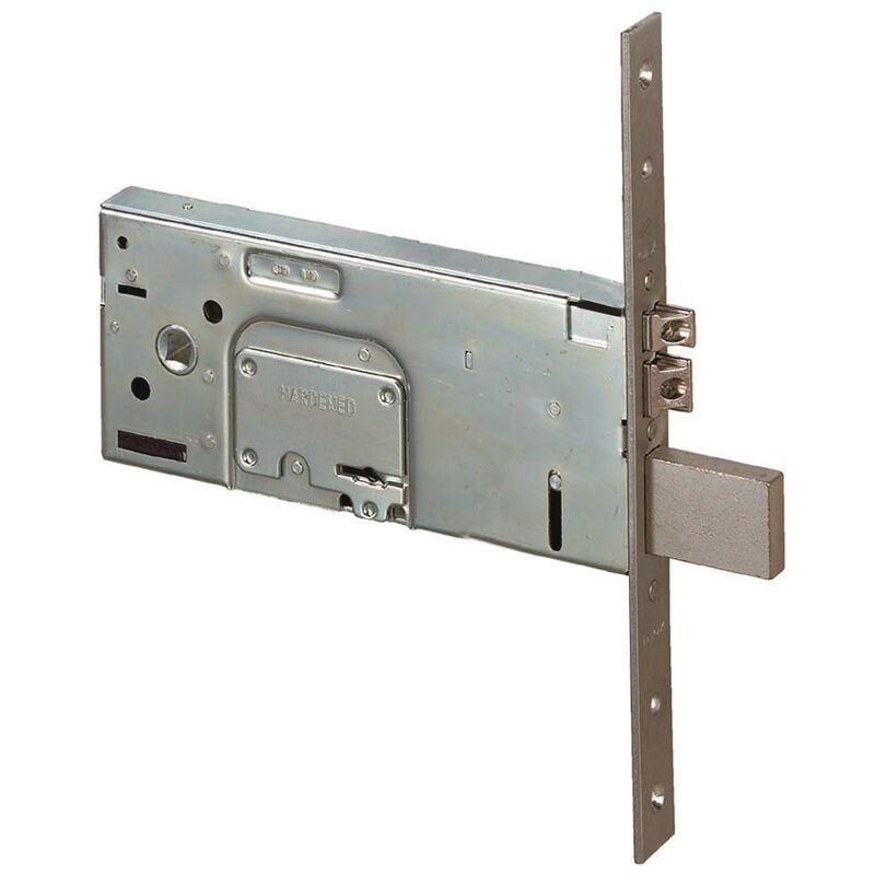 Elettroserratura a doppia mappa da infilare per fasce.NL4 mandate, protezione antitrapano, scrocco e pistone regolabili,NLscrocco autobloccante, fermo a giorno, zincata,NL2 chiavi, scatola mm. 157x78, tensione 12 V ca.