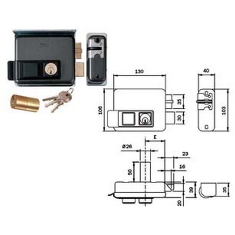 Elettroserratura da applicare verniciata - 12v ac 15w - cilindro interno - cilindro fisso ? mm.26x50 esterno - 2 mandate - scrocco autobloccante con pistone di carica incorporato - forza regolabile - 3 chiavi - bocchetta regolabile - confezione con tettuc