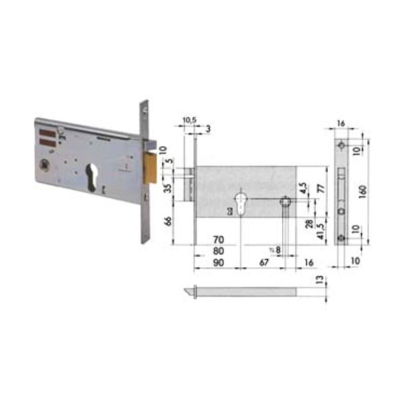 Mm.80 (14350800) scatola e frontale in acciaio con rivestimento in zinco, catenaccio con scrocco incorporato in ottone, scrocco autobloccante, fermo a giorno, con quadro maniglia da mm.8 passante, funzionante con cilindro sagomato non compreso, tensione 12v ac, scatola mm.77h. Categoria merceologica: Elettroserrature e accessori - Sicurezza - Serrature elettriche per fasce da infilare