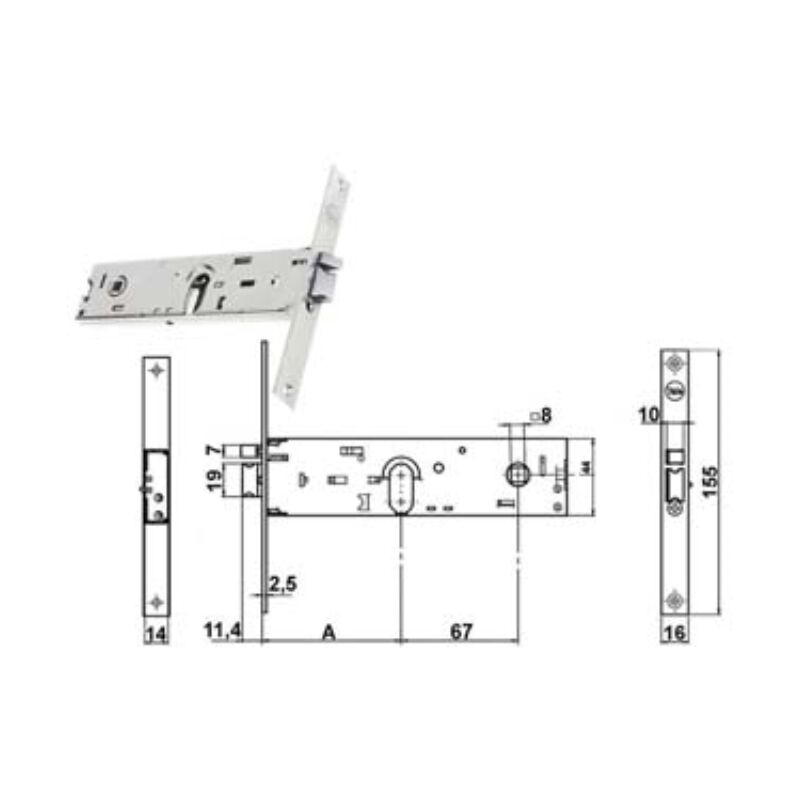 Mm.80 (y8540080080vne) per fascia stretta, scatola in acciaio zincato, solo scrocco reversibile, pistone di ricarica reversibile con richiamo tramite chiave o quadro maniglia da mm.8 passante, funzionante con cilindro ovale non compreso, scatola mm.44h., interasse mm.67, frontale da mm.16 Categoria merceologica: Elettroserrature e accessori - Sicurezza - Serrature elettriche per fasce da infilare