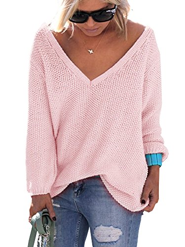 Elevesee Maglie Donna Inverno Eleganti Pullover V Scollo Manica Lunga Maglione Casual Sciolto Autunno Maglione Moda Sportiva Solido Outerwear Sweater (Dimensione M, Rosa)