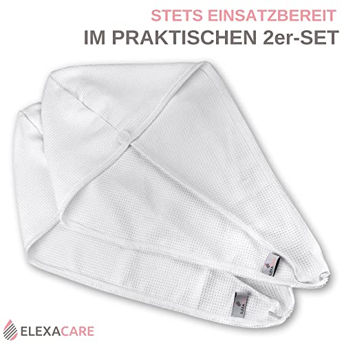 ELEXACARE Turbante per Capelli, Asciugamano Turbante con Bottone (2 Pezzi, Bianco), Asciugamano in Microfibra per Capo e Capelli Lunghi