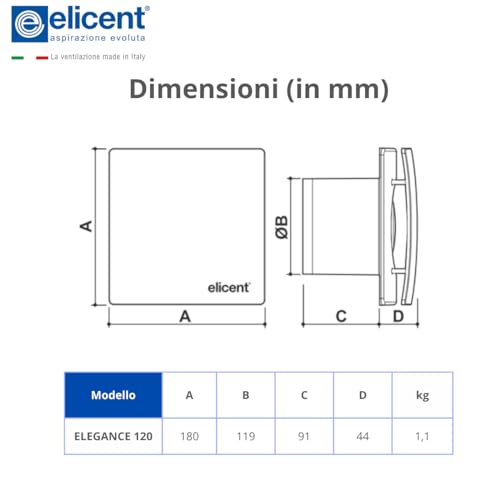 ELICENT | Elegance 120 Base, Aspiratore Elicoidale, Ø 120 mm, con Design Frontale per un' Espulsione Diretta dell'Aria, Made in Italy