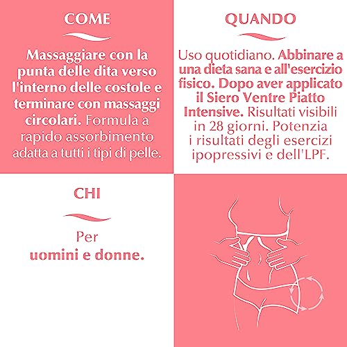 ISTRUZIONI PER L'USO: Per prima cosa, massaggiare delineando le costole con le dita verso l'interno e terminare con massaggi circolari. Abbinare a una dieta sana e all'esercizio fisico.