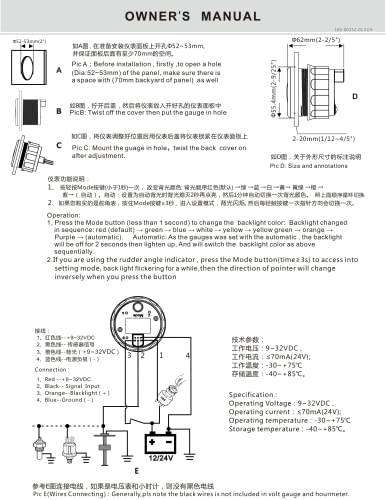 ELING Misuratore di temperatura dell'acqua da 52 mm 40-120 ℃ con retroilluminazione a 8 colori 9-32 V (nero e nero)
